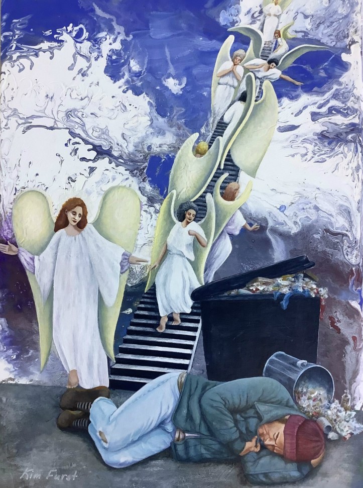 Just as Jacob had a dream while fleeing from his brother, Esau, my homeless man is having a dream while fleeing his own personal demons. Angels going up and down the ladder, connecting Heaven and Earth, reveal God’s presence and promise: that nothing can separate us from His love.