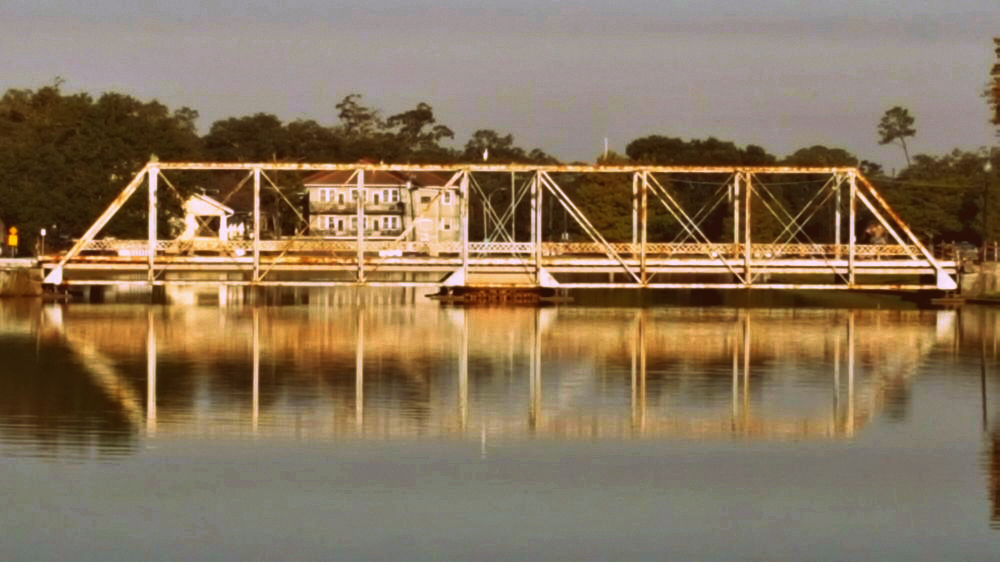 Carmen came back, and Janelle took her lunch box and set it beside her own at the side of the bridge and took her hand and led her down into the grass that was a coarse crisp grey then at the end of October and then led her out, edging along the bridge’s substructure, with both hands sliding along the dusty edge of the road, to the joint of the first piling. There had been no rain and there was no current but a cool breeze riffled the surface in places and the light was golden and touched the water and the grass and the bridge with gold and the bells of Holy Rosary rang 3:30 as Janelle sat on the substructure and let herself down, unfolding backwards, till her hair in its thick rough curls cascaded toward the water and her hands reached for the surface nearly touching their own reflections. And she found Carmen’s eyes in the water as it stilled. Carmen was standing, holding to the bridge with one hand and leaning out to look at her friend’s reflection and her own. Then Janelle looked up at her, and they both smiled, and Carmen lowered herself, smoothing her skirt to pin it behind her knees, and hung beside Janelle. The two watched the gold of the day deepen and begin to die. And if Carmen was still silent now, her silence could be shared.
