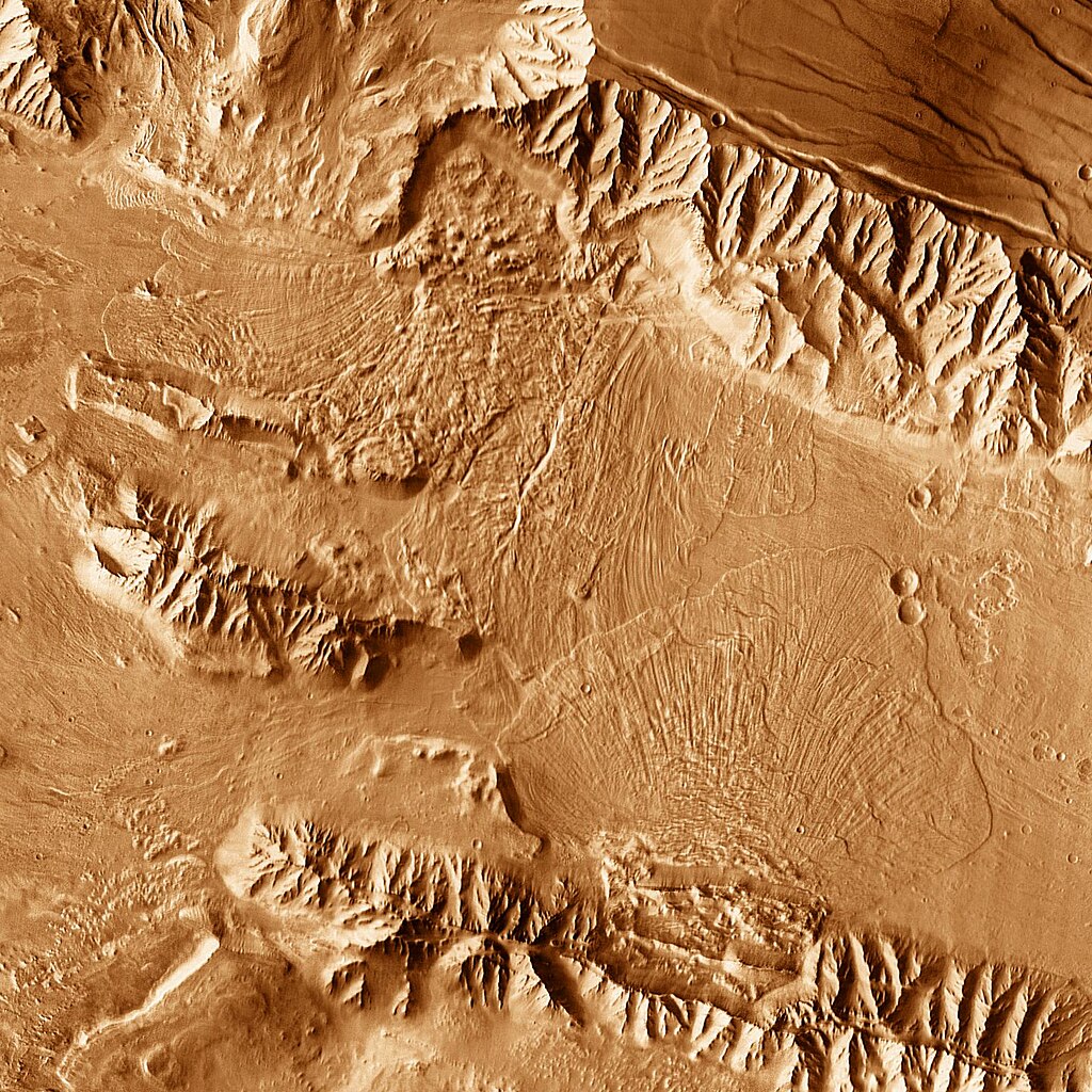 Image: Coprates Chasma landslides on Mars, NASA / JPL-Caltech / Arizona State University, Public domain, via Wikimedia Commons.