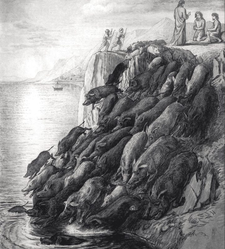Artwork: “The whole herd of Swine ran violently down a steep place,” Public Domain.