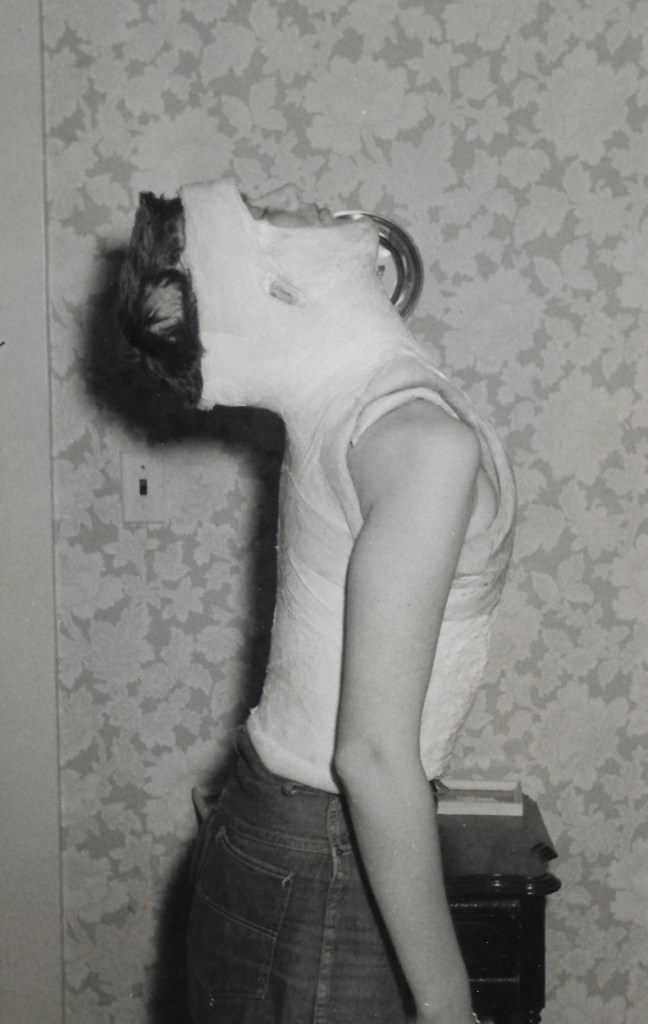 On October 9, Mom got a smaller cast that started from above her waist and lowered her head into a somewhat more natural albeit uplifted position. She was able to exchange this cast for a Thomas collar on November 11, 1952. On February 26, 1953, the collar came off for good.